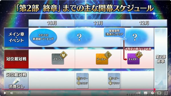 条件は ・10月1日~12月31日までの間を欠かさずログインする ・マスターミッションを毎週きっちり全部こなす ・イベントも参加してシナリオ最後までクリアする ・各クラスの戴冠戦実装時に追加されるミッションもきっちり全部こなす ・運営のリアルイベントや配信の動きは2024年を踏襲しつつ、新規の突発案件は特に無いものと仮定する の5点としています。 で、以下は長くなりますので先に結論を出しますと 年内にもらえる聖晶石は合計409個 (※ただしプレイ日数などにより若干の誤差あり)となります。 若干の誤差、の部分については以下で触れておりますので、それぞれの内訳とともにご確認ください。 ・ログインボーナス石:91石(聖晶片の変換分含む) 10月1日~12月31日までを集計対象としています。1週間あたり石4個+マスターミッションの欠片21個→石3個で合計7個。 13週間で石91個ですね。ログボの切り替わりタイミングによっては若干減る可能性もありますが、大きくは変わらないと思います。 ・呼符:29枚(マナプリ交換分含む):87石 ログインボーナスで毎週1枚×14週と、毎月5枚ずつの交換が10・11・12月の3ヶ月で15枚。合計29枚です。 人によっては1枚少なくなるかもしれませんが、基本ここも大きな変動はないと思います。 ・50日刻み・100日刻みボーナス石:80石~110石 これが算出難しいところで、人によっては30石の幅があります(50日刻みのタイミングによる)。 9月14日にサービスイン3700日、12月23日に3800日を迎えて、そのたびに10石配布(合計20石)。これは確定です。 問題は『ログイン50日ごとに貰える30石』で、これが個人差を生んできます。 サービスイン初日からプレイしてる人(Androidユーザーに限る)は9月14日頃、11月4日頃、そして12月23日頃にそれぞれログイン50日刻みの石30個をもらえるので、合計90石。 さとっちさんが受け取れるのはこの合計110石となっています。 ただ人によっては「50日刻みをついこの前貰ったので、次は当分先」などもあるでしょうし、ここはあまり気にせず「80個ぐらいはもらえる」と思ったほうが良さそうです。 ・戴冠戦ミッション石:54石(18個×3回) 剣・狂・槍・EX・騎戴冠線でそれぞれ実装されたミッションが「全部クリアすると最大で石18個」となっていました。 残る殺・弓・術でも同様のミッションがその都度に実装されると思われますので、この数字としています。 ・ストーリークリアミッション石:9石 10周年の後から実施されている『メインストーリー第2部のクリア応援企画』での石もあります。 ・2025.09.29 【期間限定】「Final Order Project [Ordeal Call Ⅰ]クリア応援キャンペーン」開催! 先日ついにこのキャンペーンがオーディールコールのクリア応援に入りまして、残りはOC2~4の3つとなります。 キャンペーンごとに石3個なので、残り3個と考えて良いでしょう。 ・生放送石:14石(12月20日) 12月20日の終章開幕直前生放送は間違いなくあるでしょう、ということでこの数としています。 ・Youtube:JP Fate/Grand Order カルデア放送局 ライト版 ~ぐだぐだ新選組・ジ・エンド~ ![]() ただし先日の生放送で公開されたスケジュールによれば、10月末と12月頭に何らかの大きめなイベントが開催されます。 10月といえばハロウィン。ハロウィンファイナル総決算イベをやるなら今年しか無いでしょうし、ハロウィンといえばエリザベート。 そうなれば大久保瑠美さんMCで生放送ライト版もある、と見ておいたほうが良いでしょう。 10月下旬に生放送がある場合はRPキャンペーンで最大14石が追加されることになるかと思います。 ・メンテ石:30個(3ヶ月分・毎月2回メンテナンスの場合) メンテについては上記のスケジュールを見る限り、それなりの数にはなるかと思います。 ・10月:ぐだぐだファイナルの終了、アサシン戴冠戦スタートのためのメンテ ・10月:アサシン戴冠戦終了、10月下旬新規イベ開催のためのメンテ ・11月:イベント終了のためのメンテ ・11月:EX・ライダー戴冠戦復刻+アーチャー戴冠戦のためのメンテ ・12月:新規イベント開催のためのメンテ ・12月:新規イベント終了・終章開幕のためのメンテ いつもの『メンテナンス終了後に石5個配布』を都合6回想定で合計30個、と算出しています。他になにかサーバーメンテが入ればもうちょっと石が増えるとは思いますが、流石にコレぐらいではないでしょうか。 ・イベントシナリオ石:14石(7石×2イベント)? 10月下旬と12月上旬スタートのイベントシナリオがどれぐらいのボリュームになるかは不明ですが、1日1節ずつの解放で7日間で完結、と仮定してこの数字、それを2回で14石としています。 また、イベントのポイント報酬などで呼符が貰える可能性も高いため、実際にはコレ以上の数に増えることはあっても減ることはないだろう、と見ての最低限の数字です。 以下は『あるかもしれない』ので、上記の合計獲得数に含まれておりません。あったらいいんだけどなぁ。 ・イベント出展石:10個?(ウインターキャラバン実施の場合に限る) 現状だと望み薄ですね!!